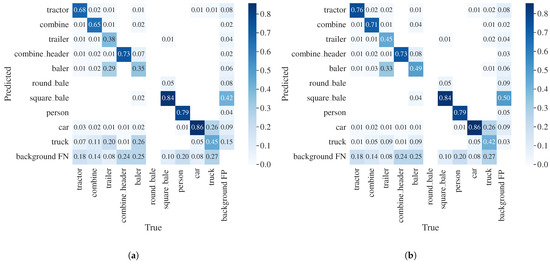 It can be seen that the ensemble module has significantly better performance, and the confusion between road vehicle classes and classes for agricultural vehicles and implements is lower. Initially, in the combined model, the classes ‘trailer’ and ‘baler’ are most often confused with class ‘truck’. However, after applying the ensemble module, the values of corresponding elements in the confusion matrix are lower and values in diagonal elements for classes ‘trailer’ and ‘baler’ improved. A similar trend can be observed for classes ‘tractor’ and ‘combine’, while values for ‘combine header’ remain the same. When it comes to the class ‘car’, there is a small decrease in the misclassification of classes ‘tractor’ and ‘baler’.