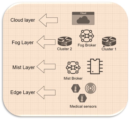 The MFHS (Mist-based fuzzy healthcare system) operates across four layers: the Edge layer, the Mist layer, the Fog layer, and the Cloud layer, each playing a crucial role in processing data for healthcare systems. In the following section, we provide a detailed description of these layers and outline their functionalities within our approach. Additionally, Figure 1 provides a concise overview of the system design, illustrating all the components utilized in our proposed approach.