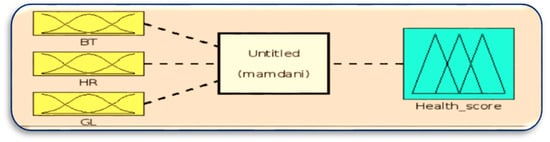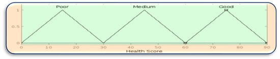 Here, the number of rules = 3 × 3 × 3 = 27 rules by using “if-then” and “and” linguistic rules as logical operators to take the minimum membership value. The rules are represented in Table 2. In the health score calculation, each normal health condition is counted as 30 points, with medium 10 points and low 5 points. Figure 6 shows the design of the fuzzy logic system to generate the health score to assist in data categorization, and Figure 7 shows the membership function of the health score.