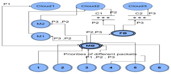 In the second phase, the Mist broker (MB) focuses on the Mist’s computational capacity (see Equation (3) below) and data priority to allocate resources for healthcare services. MB selects one of the three resources: Mist, Fog, and Cloud, to provide services for the healthcare system as follows.