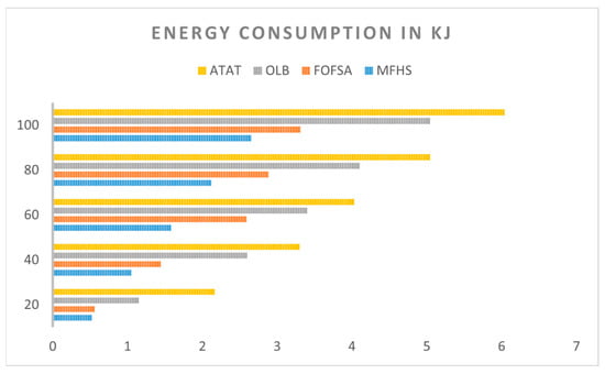 Based on the results in [15], the energy consumption of FOFSA, ATAT, and OLB using the same packets transfer 20, 40, 60, 80, and 100 are shown in Table 8—please refer to Appendix A for detailed calculations.