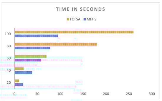 In Figure 15, we present a comparison of the processing time between our proposed MFHS algorithm and the FOFSA method, which has been demonstrated to outperform both ATAT and OLB algorithms [15], with respect to the number of packets. The chart clearly indicates that the processing time of the MFHS algorithm outperforms the existing approach, particularly as the number of packets increases. This suggests that the MFHS algorithm excels in handling big data analyses, which are crucial for IoT networks. This comparison is made without sacrificing generality, highlighting the superior performance of MFHS in terms of processing time.