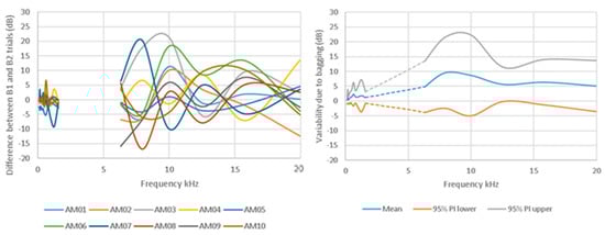 As the bare board AudioMoth showed very consistent FRFs, while the bagged devices did not, the bags themselves (or the action of bagging the AudioMoth devices) must be responsible. Indeed, analysis of the incomplete data from the pre-trial (experiment B2 in Table 1, initially intended only to set audio levels) showed a large variation between repeat bagging of the same AudioMoth (Figure 3). In other words, putting the AudioMoth in the bag introduced variations in the FRF, and repeating the operation on the same device, in the same way, did not result in the same outcome. On average, across all frequencies and AudioMoth devices tested, using the large bag (B1 and B2) added variations in the response of ±2.9 dB. However, low frequencies were less affected than higher frequencies, and variability peaked at around 8 kHz, with a mean uncertainty of ~9.6 dB with 95% PI of −2.4 to 21.6 dB (Figure 3).