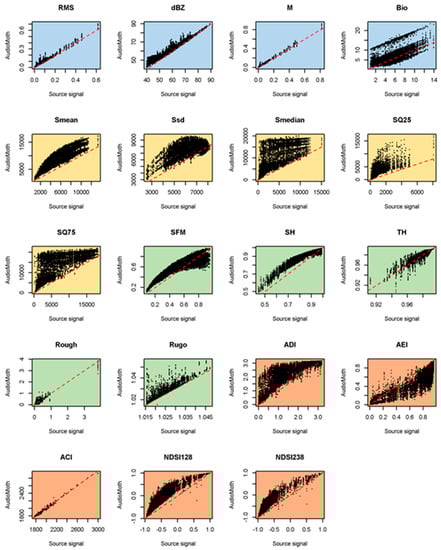 Comparison of acoustic metric values derived from 998 source signals and as recorded on 10 AudioMoths with a B4 bag. The dashed line is the line of agreement. The metrics are described and colour-coded in Table 2.