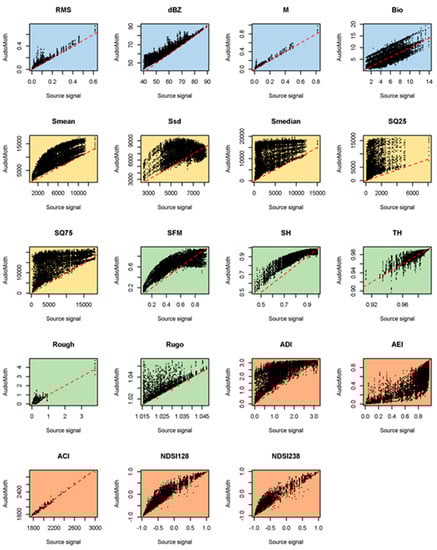 Ecoacoustic indices (orange in Figure 5, Figure 6 and Figure 7) tended to deviate more from a 1:1 line when calculated from bagged than bare board AudioMoth (e.g., NDSI), although ACI remained consistent and true to the source signal throughout. As with the metric M, indices based on statistical properties (yellow in Figure 5, Figure 6 and Figure 7) often split into multiple parallel curves in the bagged devices. Visually, the metrics based on geometric properties (green) sometimes showed a closer fit to a 1:1 line when recorded in a bagged AudioMoth (e.g., SFM), presumably because the housing reduced the high-frequency content.