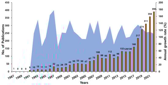 The total number of publications provides the relevance of the domain over the years since 1987. It was observed that there had been a consistent increase in the number of articles published over the years, and since 2017 there was an increase of at least 30 documents. In the years 2018 (217) and 2019 (274), there was an increase of up to 50 documents from the previous years. In the past decade, the number of publications has doubled, and there are already 748 publications published in the years 2021 and 2022, which was half the number of publications in the past decade (2011–2020). The annual growth rate was highest in the year 1997 (177%) when the number of publications increased to 32 from 18 in the previous year, but the growth rate in the past decade was considered significant as there was a consistent increase in the number articles and it was a minimum of 100% of the previous year (Figure 1).