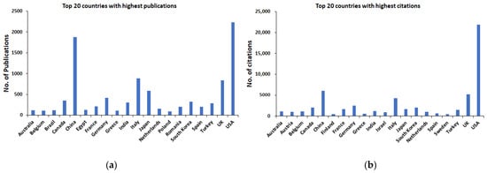 Top 20 countries with highest publications (a) and citations (b).
