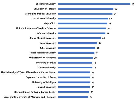 All the top 20 institutes ranked according to the number of publications were affiliated with at least a minimum of 30 articles (Figure 3). Zhejiang University from China published 81 articles, and the least of the top 20 was from the Carol Davila University of Medicine and Pharmacy, Romania, with 34 publications. Fudan University, China, and the University of Milan, Italy, published 38 publications, while 36 articles were published by three American institutes; the University of Texas MD Anderson Cancer Center, the University of Michigan, Harvard University, along with the Sapienza University of Rome. Ten out of the 20 institutes have published between 40–60 articles since 1987.