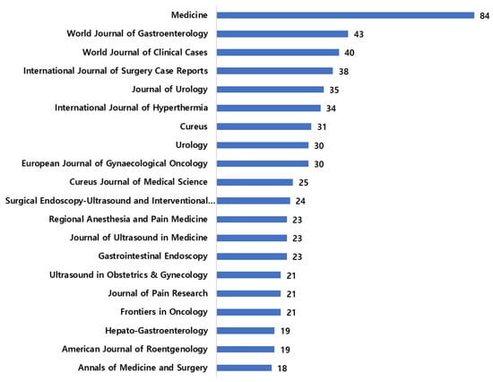 Figure 4 shows the top 20 journal sources that published the most articles relevant to the research domain in question. Medicine journal has published 84 articles and is ranked the top journal, while the World Journal of Gastroenterology is in second place with 43 articles. Fifteen of the 20 journals have published 20–40 articles, and 18 articles were published in the Annals of Medicine and Surgery, which is seen at the 20th spot, while 19 articles were published each in Hepato-Gastroenterology and American Journal of Roentgenology. Ultrasound in Obstetrics & Gynecology, Journal of Pain Research, and Frontiers in Oncology have published 21 articles each related to cancer-induced pain and its management with ultrasound.