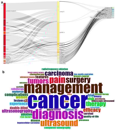 The Sankey chart (Figure 5a) provides information on the research output that correlates the countries, authors, and keywords in the field of cancer-induced complications and ultrasound. China has published the maximum number of articles with 18 authors, namely Napoli A, Wang Y, Li J, Wang L, Li Y, Zhang Y, Zhang L, Liu Y, Catalano C, Wang W, Liang, P, Wang J, Yu, XL, Liu FY, Han ZY, Bhatnagar S, Cheng ZG, and Yu J. The USA comes in second place with seven authors. Then comes Australia at third place, and the least was observed from the UK with two authors. The most explored domains are cancer/tumor, ultrasonography, pain, surgery, diagnosis, complications, etc., and all 20 authors have conducted research in most of the keywords analyzed in our study. In the word cloud analysis (Figure 5b), keywords that dominated the bibliometric analysis were cancer, pain, diagnosis, ultrasound, tumor, and surgery which are the predominant keywords that denote the research outputs in the field of cancer management with ultrasound.