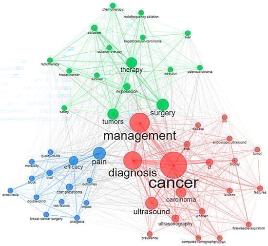 Cluster 1: Red cluster with 20 keywords is mostly related to cancer, management, and diagnosis, which are the most searched and studied keywords in the field of cancer management. Along with that, ultrasound, ultrasonography, biopsy, and computed tomography are some of the keywords that appeared in the red cluster.