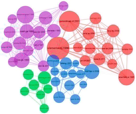 Co-citation network analysis resulted in four different clusters that contained manuscripts that deal with every aspect of the research domain (Figure 7). A total of 48 documents were identified, where 13 documents were identified in the red cluster, which contained two prominent articles published by Dr. Wiersema and coworkers, Dr. Gunaratnam and Dr. Aruna Sarma, affiliated with Mayo Clinic, Rochester, Minnesota, and St. Vincent Hospitals and Health Care Center, Indianapolis, Indiana. They reported a case study where endoscopic ultrasound was performed for a patient who was suffering from abdominal pain due to pancreatitis with pseudocysts, and the patient was successfully alleviated from the cysts and pain using endoscopic ultrasound. This study aided in a prospective study reported by the same group in 2001 headed by Wiersema, where 58 patients suffering from pancreatic cancer-induced pain were treated with endoscopic ultrasound-guided celiac plexus neurolysis (CPN). Both studies established that the endoscopic ultrasound technique was safer to perform, and in the prospective clinical trial, the conclusion was that CPN was safely performed with EUS [42,46]. EUS reported as a successful strategy in the mitigation of cancer pain, and additionally, the opioid side effects were avoided. EUS strategy was adapted from their previous results while targeting CPN for pain relief was approached with evidence provided by Eisenberg et al., who published a meta-analysis stating how CPN neurolysis can significantly help in cancer pain management [36]. The review was concluded with a recommendation that the CPN can be an answer for pancreatic or other intraabdominal cancer-induced pain with minimal adverse effects, and randomized controlled trials were recommended to obtain strong evidence for EUS-mediated CPN as an alternative to opioids.