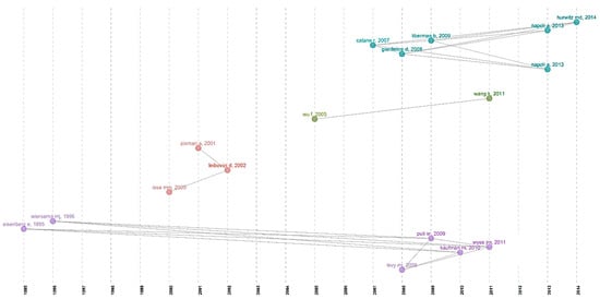The major observation of this co-citation network analysis is that the red and purple clusters which have the most number of articles, and they are published in the 1990s and early 2000s. These articles remained as the basis for the studies conducted in the past two decades involving ultrasound-mediated pain relief, which are in the other two clusters; apart from that, the articles published in the 1990s were cited continuously in the articles published in the past two decades in the respective cluster. This was demonstrated in the Historiographic direct citation network (Figure 8), which is an achronological citation network that develops the intellectual structure. Evidence provided by Dr. Wiersema and co-workers and Dr. Eisenberg and co-workers was the basis for many developments in the research domain. Both studies have established the use of endoscopic ultrasound for relieving abdominal pain due to cysts or metastatic tumors [36,42]. This was studied and cited by many future reviews and research that involves cancer pain relief, like Dr. Puli et al., 2009, Wyse et al., 2011, Kaufman et al., 2010, and Levy et al., 2008, who reported a systemic review on EUS-guided CPN for pancreatic cancer and pancreatitis. Similarly, the transrectal prostate biopsy was carried out comfortably with the help of ultrasound by Issa et al., 2000 Zisman et al., 2001 and Leibovici et al., 2002 [58,59,60]. High-intensity focused ultrasound was directly applied on the solid tumor for the treatment of pancreatic cancer by Wu et al. in 2005, and it was adapted by Wang et al. in 2011. These sets of studies have studied the mechanical or thermal effect of ultrasound on solid tumors, and these studies have been the steppingstone of the current research with HIFU as a potential treatment alternative for cancer that can be utilized individually in combination with other therapeutic modalities [61,62]. As mentioned before, the studies carried out by Catane et al., Gianfelice et al., and Liberman et al., have influenced several researchers to focus on ultrasound for better management of breast surgery-induced pain by blocking the pectoral nerve in the thoracic wall instead of paravertebral nerve blockade. This approach was successfully carried out by researchers such as Napoli et al. and Hurwitz et al., and they provided solid evidence for ultrasound-mediated nerve blockage and pain relief [51,52,54].