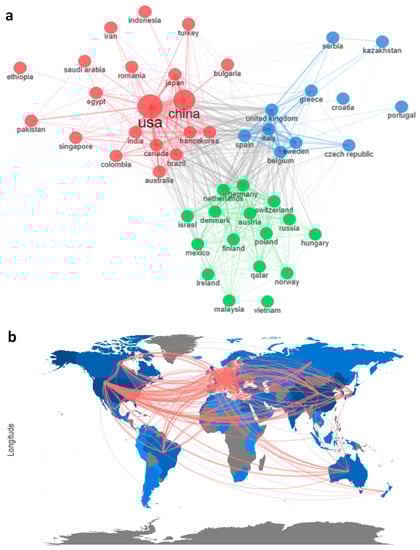 Keyword co-occurrence analysis provides the uniqueness of each concept and its application in the research domain of interest [43]. Co-citation is an instance where the link between two different articles is established when a third document cites both articles. Apart from demonstrating the most cited papers, co-citation network analysis defines the starting point of the science towards its application for technology and is essential for the emergence of technology [44]. Further, collaboration networks provide information on authors from different countries working together for better development of technology. The increase in the number of collaborating countries indicates an improvement in the current research and technology [45].