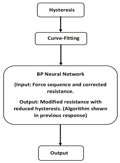 Several methods have been proposed to address hysteresis and modify the hysteresis nonlinearity of piezoresistive sensors, including curve-fitting models and neural network approaches [20,21,22,23]. Though hysteresis approximation using BPNN has already been employed, the novelty of the proposed method lies in its specific application to a conductive fiber-based tactile sensor. Furthermore, BPNN was employed to modify the hysteresis nonlinearity in this particular sensor type, which has not been explored in previous studies within the context of conductive fiber-based tactile sensors.