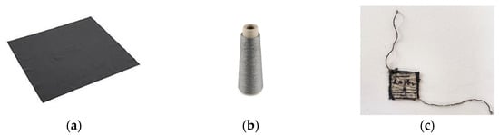 - Silver-plated conductive thread: To establish conductive connections with measuring devices, a silver-plated conductive thread was used. MADEIRA yarn (detox 290 ± 6 HC 40) was employed for sewing [32,33].
