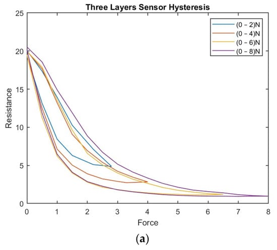 Figure 1 describes the experimental setup used to design four distinct types of sensor units with varying layers, along with the process of collecting output resistances by applying force sequences. These force sequences and the corresponding corrected resistances were employed as inputs to train the BPNN, resulting in favorable convergence and high accuracy. Through validation experiments, a reduction in the maximum error caused by hysteresis was demonstrated in the proposed method, wherein the sensor’s full-scale output was reduced from 24.2% to 13.5%.