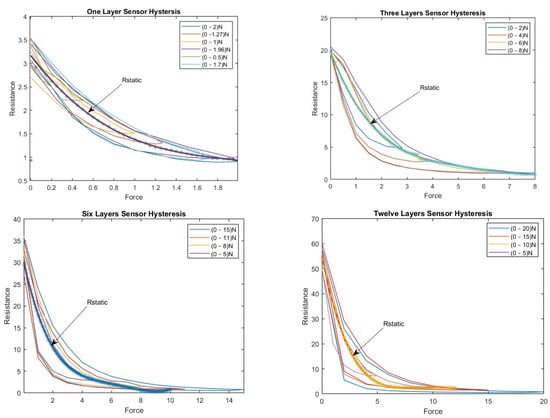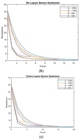 In the current study, four tactile sensor samples (one, three, six, and twelve layers) were used, as shown in Figure 5. The sensor was designed in layers three, six, and twelve to increase the range of applying force to be measured. An increase in the number of layers implies an increase in the capacity of the tactile sensor to apply force, and it can be used in other applications, such as in the patient’s seat or bed.