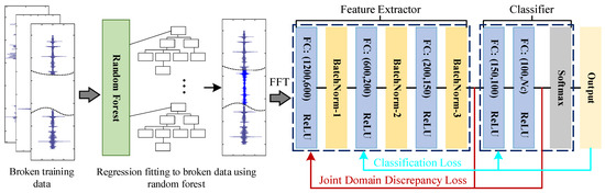 The random forest algorithm gradually learns the complete part of the training data and performs regression-fitting predictions on the damaged part. In this study, the number of decision trees in the random forest is set to 100, and the number of leaves is 5 groups. At the same time, it is stipulated that the prediction rhythm of predicting 1 point for every 15 points will gradually slip, and the fitting and repair of the damaged data will be completed finally. It is worth noting that “broken data” refers to sample data that loses part of the fragmented information. The repaired time-domain training samples are input to the feature extractor after undergoing a fast Fourier transformation, in which the number of neurons is set to 1000, 800, and 1200. Additionally, the domain discrepancy loss function is introduced to solve the problem that there is a significant distribution discrepancy between the training samples and the final fault samples in the target domain. It is worth noting that the Wasserstein Distance (WD) was chosen to evaluate the discrepancy between the datasets [35]. The specific mathematical expression is as follows: