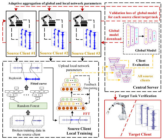 Despite the preliminary progress made in research on protecting data privacy through federated learning, further advancements are necessary to fully address this issue [15]. Existing federated learning methods often assume that users conform to the same data distribution, meaning that each user collects information on similar mechanical equipment under comparable working conditions. However, in practical scenarios, due to diverse project requirements and distinct operating conditions of industrial equipment, there exist significant discrepancies in data distribution among customers, which pose challenges for the generalization of conventional fault diagnosis methods [16]. Transfer learning breaks the basic assumption that training data and test data must satisfy independent and identical distribution, as it enables the transfer of labeled information from a source domain to diagnose unknown target domain samples [17]. Chen et al. [18] proposed a dual adversarial-guided unsupervised multi-domain adaptation network, which constructed the edge confrontation module (EA-Module) to extract the common features of samples in multiple sets of source domains and validated the method on the transfer task of a rotating machinery dataset. Li et al. [19] proposed a novel joint attention feature transfer network to address the issue of data imbalance in real-world industrial scenarios. Experimental results on the gearbox dataset demonstrate its superior adaptability to sample scarcity.