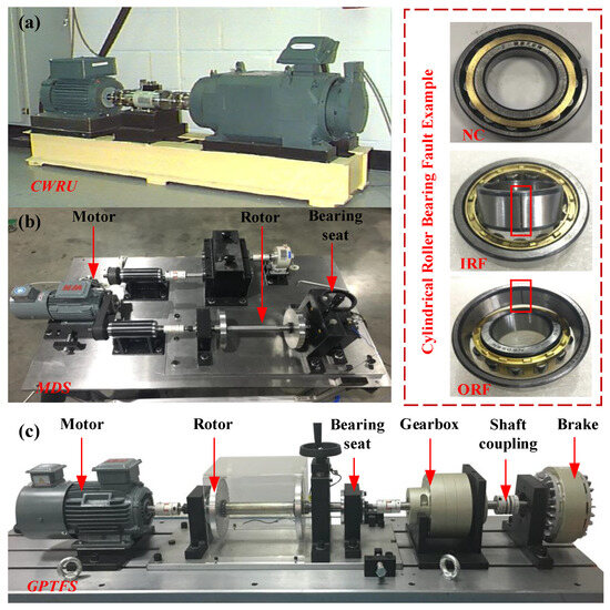 In this section, three sets of bearing datasets (including a public dataset and two laboratory simulation datasets) are utilized to validate the efficacy of the proposed method, encompassing three health status categories: normal condition (NC), inner ring fault (IRF), and outer ring fault (ORF). The data set information is shown in Table 1.