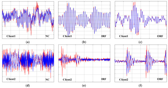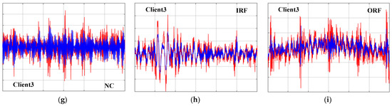 The random forest algorithm is used to perform regression fitting on the damaged training data in the source client, and the fitted data is directly applied to the training process of the network. Figure 4 shows the comparison of the fitting curves of the training samples for each health type of the three groups of source clients in Case 2. It can be clearly seen from the figure that the predicted data for client 1 was constructed by using the CWRU data set, and the real data met a relatively ideal fit, which shows that there are obvious periodic fault characteristics in the data set. As more uncertain environmental interference is mixed into the data set, the peaks of the fitting curves predicted in Client 2 and Client 3 begin to stagger from the real data, but the trend of the fitting curves is always consistent with the real data.
