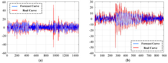 The comparison display of forecast data and real data in case 2: The blue curve represents the predicted data. The red curve represents the real data.