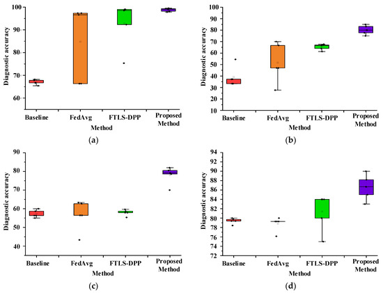 The FTLS-DR method proposed in this study outperforms other comparison methods in terms of diagnostic accuracy and fluctuation range across all four cases. Specifically, in the case of complete data training in case 1, the diagnostic accuracy of the proposed method in each client task and target client task is higher than 98%, with a standard deviation of 1.04%. Comparing the FedAvg method with the FTLS-DPP method, the diagnostic accuracy is only 84.78% and 92.83%, and the standard deviation is greater than 7.21%. The proposed method still demonstrates superior model generalization performance and diagnostic accuracy, even in the presence of corrupted training data. Specifically, the diagnostic accuracy for the unknown target client diagnosis task remains above 78.06% when 25% of the training data is damaged. It can be inferred that the FTLS-DR method proposed in this paper has better universal feature extraction capabilities for fault samples, rendering it more suitable for diagnostic tasks in complex scenarios.
