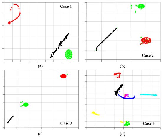 In order to demonstrate the distribution of features extracted from data samples and validate the advantages of feature extraction using the proposed FTLS-DR method, the high-dimensional features of the target client sample extracted in the final verification link are visualized and displayed through dimension reduction [38], as shown in Figure 7. In cases 1 to 3, each group of clients encompasses three distinct bearing health states, while in case 4, seven bearing health states are set for the problem of misclassification of fuzzy fault samples. The proposed federated transfer strategy still shows satisfactory diagnostic results in the face of fault sample diagnosis under unknown working conditions. From the extracted sample features, it can be seen that the sample data features in each healthy state are accurately extracted and perfectly classified. Except for a small number of fault samples in the outer circle that were misclassified in case 2, there was a staggered phenomenon of individual fault sample cluster boundaries in case 4. This further demonstrates that the FTLS-DR method can still perform satisfactorily in the face of complex transfer tasks across devices and bearing models.