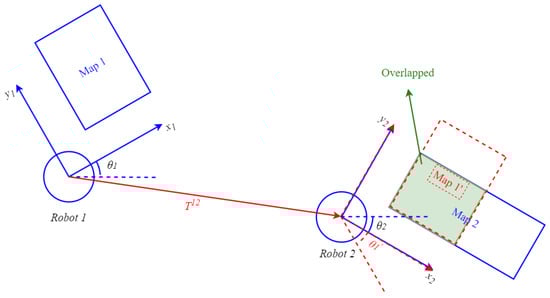 - Associate maps for merging: Consider two maps and with different coordinates, as shown in Figure 2. The transformation matrix between them is denoted as , as defined in Equation (2).