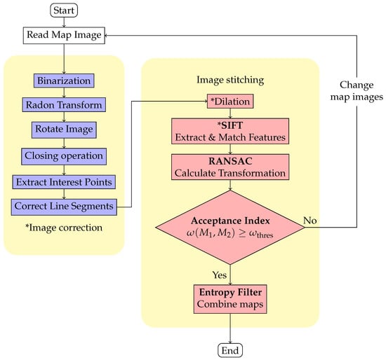 In this section, we present our novel image pre-processing method, which effectively mitigates the impact of sensing errors and uncertainties in maps prior to their stitching. The proposed pre-processing operation focuses on eliminating noise and distortion issues in the occupancy grid map through several image processing steps. By applying these steps, we ensure that the existing image-stitching method is unaffected by noise and can seamlessly merge the maps. In what follows, we will describe the existing process of imaging stitching in Section 4.1, and our proposed operation in Section 4.2.