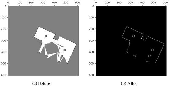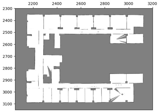 In binarization, each grid is classified using a threshold value . If the pixel value of a grid  is less than , it is classified as occupied and assigned a new value of 255. If  is greater than or equal to , it is classified as non-occupied, and assigned a new value of 0, as shown in Equation (15). After binarization, the map only contains two types of grids, as illustrated in Figure 5.