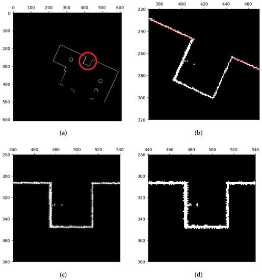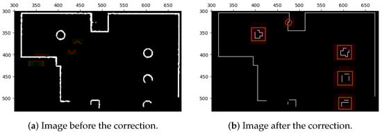Algorithm 2 is the final step of our proposed image correction process, presented in Figure 4, which aims to correct the line segments in the occupied area. The algorithm takes the image  with interest points and the image M after closing as inputs, along with the distance parameter L, to ensure that the new line segments resemble the original data with some uncertainty and are parallel to the coordinates. The algorithm finds points on the map that form line segments and corrects them using the following five steps: