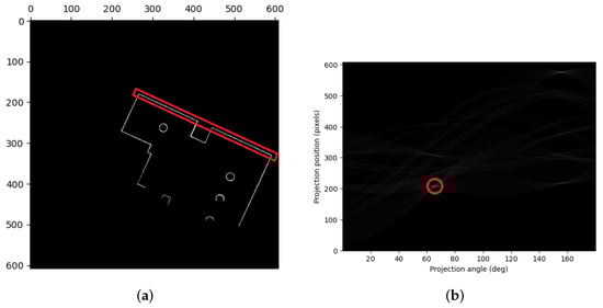 Radon transform. (a) Map image. The longest line is marked with a red rectangle. (b) Two-dimensional space linear function . The largest value is marked with a red circle.