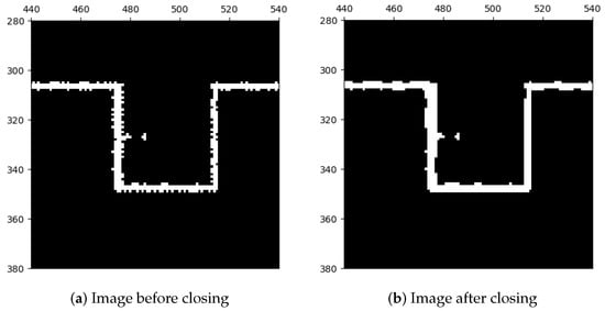 To improve the image, we performed a closing operation as shown in Figure 8, which applies dilation followed by erosion. This operation expands the foreground regions (i.e., the occupied image areas), fills gaps and defects by dilation, and then restores the area to its original size by erosion. The closing operation can be represented mathematically by Equation (17), where the ⊕, ⊖, and • operators represent dilation, erosion, and closing, respectively.