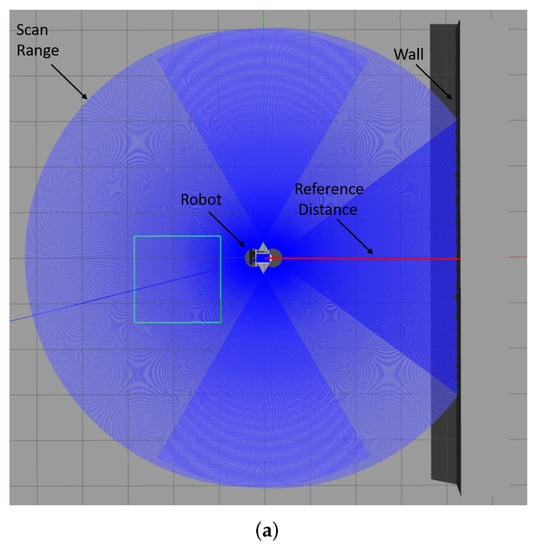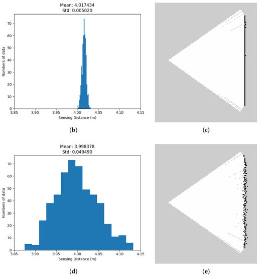 In Figure 12, the displayed maps exhibit variations in coordinates due to differences in rotation and translation resulting from mapping from various origin positions. Additionally, we manipulated the resolutions of the maps to create variations in their scales. Moreover, we investigated the impact of sensing errors on the map quality, as depicted in Figure 13. In Figure 13a, the robot is positioned at the center, and the blue area represents the LiDAR scanning range. The long object on the right depicts the wall being measured, with the red line indicating the reference distance of 4 m from the robot to the wall. We adjusted the LiDAR signal with different sensor errors, represented by standard deviation, and mapped the wall into occupancy grid maps. The effects of sensing errors can be observed in Figure 13b–e. Mapping with a lower standard deviation of LiDAR measurement (Figure 13) resulted in a more accurate representation of the wall (Figure 13c). Conversely, mapping with a higher standard deviation of LiDAR measurement (Figure 13d) led to a distorted representation of the wall (Figure 13e). These findings highlight the importance of low standard deviation in LiDAR measurements for constructing accurate maps.
