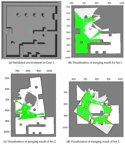 Merging results with the existing method in test case 1. In (b–d), the green areas represent correct pairings of grids, whereas the red areas represent incorrect pairings. Among these results, only the result of Set 1 correspond to the environment (a).
