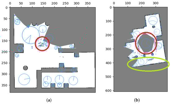 Mills’ method showed ineffective results when merging these occupancy grid maps, mainly due to feature matching errors. During feature extraction, extreme points are calculated based on the value and distribution of pixels, leading to the inclusion of unknown areas with high uncertainty and generating unnecessary features without matching relationships between maps. This issue is highlighted in Figure 15 where red circles indicate these errors. Furthermore, sensing errors can also result in the extraction of features without matching relationships. A smaller number of features were extracted in the occupied area of Figure 15a, while a larger number of features were extracted in the occupied area of Figure 15b (marked in green circles). These feature extraction errors lead to ineffective map merging, as evidenced by our results.