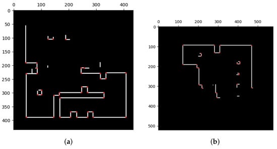 Figure 16 presents the results of feature extraction after applying our proposed image pre-processing. It is notable that features are selectively extracted only at the corners of occupied areas. Unlike Figure 15, this approach effectively excludes the influence of uncertainties and sensing errors on feature extraction, making it more efficient for true matches of features and the subsequent stitching method. Furthermore, Figure 17 displays the merging results for the three datasets obtained by applying our image pre-processing operation before utilizing Mills’ method (as depicted in Figure 4). The corresponding acceptance indices are presented in Table 4. The results demonstrate a close resemblance to the characteristics of the simulated environment. Moreover, acceptance indices surpassing the predetermined threshold () signify successful merges. These findings validate that our proposed operation effectively eliminates the impact of sensing errors and uncertainties in occupancy grid maps, resulting in accurate feature matching and correct map merging. Furthermore, Table 5 illustrates the superior performance of the stitching method when coupled with our image pre-processing operation compared to the method without such an operation.