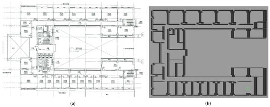 Environment of test case 2. (a) Floor plan of Yonglin biomedical engineering hall. (b) Simulation environment of Yonglin biomedical engineering hall.