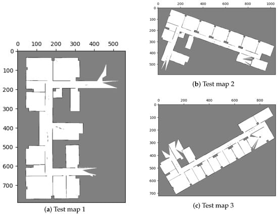 Robot mapping utilizes different types of maps, and the methods for merging them may vary. The commonly used maps include occupancy grid maps, feature maps, and topological maps []. Occupancy grid maps are widely used and can be easily implemented in any environment []. Feature maps require less memory space, but their complex feature extraction process consumes computational resources. Topological maps depict a network structure and are useful for specific tasks such as navigation and path planning. In this study, we use occupancy grid maps as they have abundant applications in the literature.