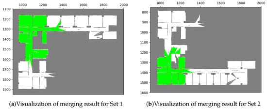 The merging results for these two sets are illustrated in Figure 20, and it can be observed that most of the overlapping grids have accurate pairings (green areas), with only few grids having incorrect ones (red areas). These red grids are caused by minor errors due to image rotation. The results indicate that the merged maps are consistent with the upper and lower parts of the environment. Additionally, the corresponding acceptance indices are listed in Table 8, both of which exceed the threshold value (), indicating successful merges.