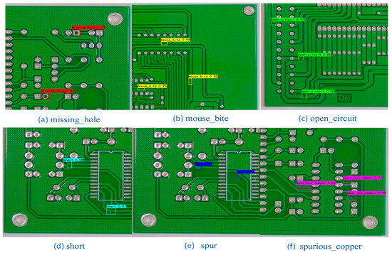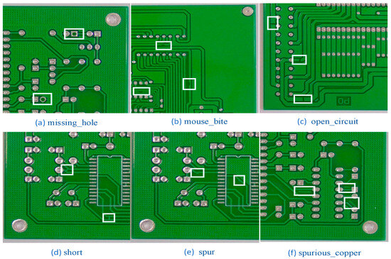 In order to verify the detection performance and prediction performance of the DCR-YOLO model, comparison and ablation experiments were conducted. The experimental data in this paper were obtained from the Human–Computer Interaction Open Laboratory of Beijing University, Beijing, China. This open dataset [33] contains six types of printed circuit board defects required for the experiments. The computer system required for the experiment was Windows 11 operating system and the programming language was Python programming language.