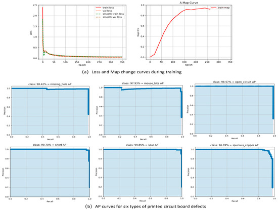 The DCR-YOLO model training process loss change curve and training process map change curve are shown in Figure 7a. After 350 epochs of training, the loss curve shows that the loss function is basically in a converged state after 200 epochs, while the map change curve shows that the average accuracy value of the model reaches about 90% at 175 epochs, and the map value is basically smooth after 260 epochs. The average accuracy curves of each category after training are shown in Figure 7b, and the average accuracy of each category is basically above 95%.