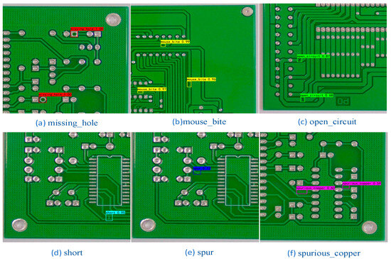 This experimental dataset came from the open dataset of printed circuit board defects from the Intelligent Robotics Open Lab, with a total of 10,668 images. First, 2667 images were randomly selected from these experimental data, which contain an equal number of images of six types of printed circuit board surface defects, as shown in Figure 6: missing_hole, mouse_bite, open_circuit, short, spur, spurious_copper. The training set consisted of 2160 images, the validation set consisted of 240 images, and the test set consisted of 267 images.