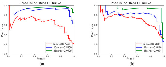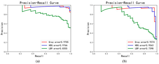 As can be seen from Table 1, when all sub-images are gray images, the accuracy increases continuously with the sliding step in both vertical and horizontal directions. Similarly, it can be seen from the P-R curves in Figure 4 that the area in both vertical and horizontal directions is highest when the sliding step is set as 25, where the area represents the mAP. Therefore, the image sliding step was set as 25 for both vertical and horizontal directions.