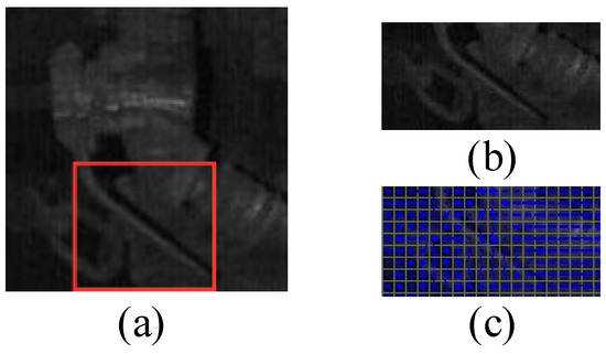 Firstly, the sub-images are made in the vertical direction in Figure 6a. The size of each sub-image is fixed as 150 × 75 and the sub-images are generated by sliding in steps of 25 from top to bottom. One of them is depicted in Figure 6b. The HOG features of the sub-image in Figure 6b are illustrated in Figure 6c. All the HOG features of sub-images in vertical direction are extracted and inputted to a SVM model as training sample to obtain the localization result. Similarly, for each sub-image in vertical direction, the same operations are performed in horizontal direction, where the size of each sub-image is reduced to 75 × 75 and the step size is set as 25 from left to right. Finally, based on the localization result of an angle cock, the handle localization result can be obtained using the SVM model, as presented in the red rectangular box in Figure 6a.