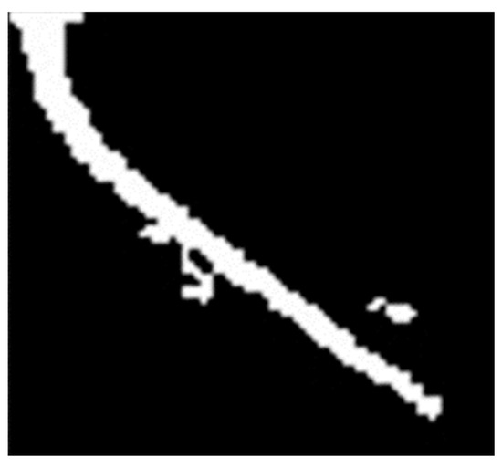 After obtaining the handle localization result of an angle cock, the non-closed state can be detected firstly. The HOG features are used as two different feature forms for the closed and non-closed state, which are then judged by a SVM model. If the angle cock is in the non-closed state, then the misalignment state should be detected. This detection is realized by determining whether the tilt angle of the minimum bounding rectangle for the handle exceeds the threshold. Before performing the curve fitting operation, the obtained handle of an angle cock was first binarized and extracted by using connected domain analysis, as shown in Figure 7.