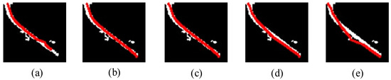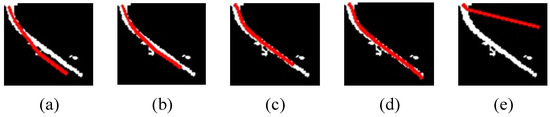 Firstly, a rectangular window with width of and height of in the upper left corner of the image is selected, and its upper left corner is regarded as the search starting point, which is denoted as . The white pixel area in the window is projected vertically to obtain the abscissas of all white pixel points. Meanwhile, the median of these abscissas is calculated as the abscissa of the fitting point (), expressed as . In each rectangular window, the proportion of white pixels is random and different. Therefore, the value of abscissa of the fitting point () is not necessarily half of , while the abscissa of the next search starting point () is half of . At the same time, the ordinate of the fitting point is taken as half of . Therefore, the coordinate of the first fitting point is . This rule traverses over the entire image to obtain the coordinates of the starting point () and the fitting point () of each search. Following that, the coordinates of each obtained fitting point () can be stored until all rows or columns of the entire image are traversed. When the search is over, all the stored fitting points are connected to form the final fitting curve [32].