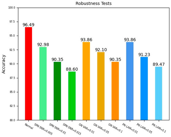 In order to verify the robustness of this method, the salt and pepper noise (SPN) with different signal to noise ratios (SNR), along with the Gaussian noise (GN) with different variances (VAR) of mean 0, and the Poisson noise (PN) with different wavelengths, were added to the original image to represent the images acquired in different environments. The test result is shown in Figure 11. As long as the image quality is changed, the accuracy of the misalignment state detection fluctuates slightly. The SPN appears as a discrete distribution of pure white or black pixel dots on the image. These random pixel dots cover some information of the angle cocks, which leads to the greatest effect on the detection of angle cocks. When the SNR is 0.05, the detection accuracy decreases by 3.51% compared to the normal image. As the SNR continues to increase, the detection accuracy decreases. The GN is an additive noise. When the VAR is 0.01, the detection accuracy decreases by 2.63%, and as the VAR increases, the detection accuracy gradually decreases. For the PN, the detection accuracy decreases by 2.63% when the wavelength is taken as 0.01. As the wavelength increases, the detection accuracy also decreases. The reason for this is that the noises blur the contour of the target and decrease the target detection accuracy. This experiment result shows that our method has strong robustness to the images in different noisy environments.